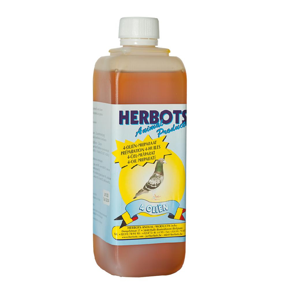 Herbots 4 Oliën (4 óleos) 28,50 € Desconto de %. IVA incluído. Partilhar Comprar Contactar Herbots 4 óleos é uma mistura equilibrada de quatro óleos puros que são facilmente absorvidos pelo organismo dos pombos. Óleo de gérmen de trigo: rico em vitamina E; Óleo de fígado de bacalhau: rico em vitamina B; Óleo de alho-poró: promove a flora intestinal; Óleo de girassol promove a digestão de gorduras. 500 ml Marca Herbots