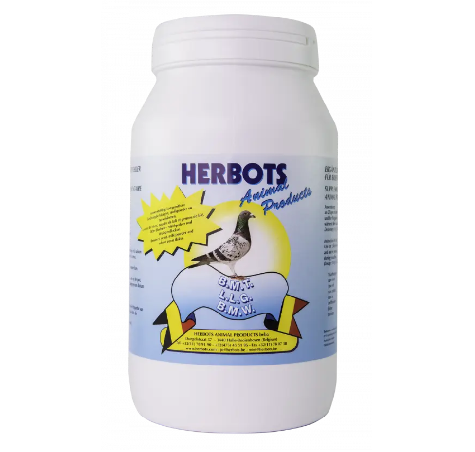 • Frasco branco de suplemento para aves da marca HERBOTS com etiqueta azul e imagem de pombo.
