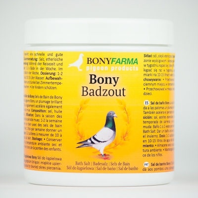 Bony Badzout (Sais de Banho) 11,50 € Desconto de %. IVA incluído. Partilhar Comprar Contactar Bony Sal de Banho O Sal de banho Bony dá aos pombos uma plumagem brilhante e macia. Também acelera o período de muda. Composição: sal, óleos essenciais. Uso: Na temporada de corrida e período de muda: Dê um banho 1-2 vezes por semana com Sal de banho Bony. Dê um banho uma vez por semana no inverno. Dosagem: 1-2 colheres de medição em 10-15 litros de água de banho. Disponível em: 500 g Marca Bonyfarma